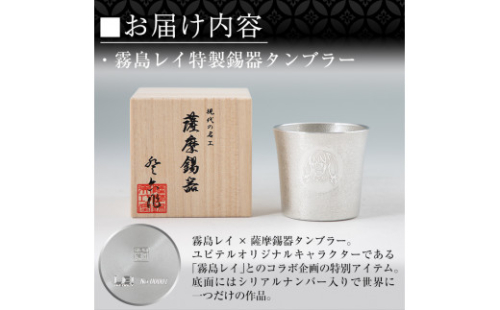 《100年以上の老舗店・薩摩錫器工芸館》 霧島レイ×薩摩錫器タンブラー。 現代の名工とコラボレーション!新しい錫の企画職人の緻密な技術が世界から注目を集める、薩摩の伝統工芸。 それぞれが長い歴史と受け継がれた高い技術力により、個性的で独特な魅力を持っています。 コラボしたことをきっかけに、伝統工芸の高い技術・その品質に、国内外から注目が集まっています。 すべての商品にはシリアルナンバー入り世界に一つの作品。 また、コロナ禍におうち時間が増えたことで、日常生活をより豊かにしたいという思考が強まり霧島から日本にまた世界に発信していきます。 【薩摩錫器とは】 鹿児島県霧島市を代表する伝統工芸品です。 300年の歴史を持つ薩摩藩ゆかりの錫細工です。 錫器は使うほどに味わいが出て手にするとずっしりと重みと温かさがあります。 また、イオン効果があり、焼酎の味がまろやかになるといわれています。 【霧島レイとは】 霧島生まれの、ユピテルオリジナルアニメキャラクター。 サイバネティック少女、17歳。 趣味は星を見ながら宇宙を想像すること。 薩摩錫器工芸館 株式会社 0995-45-0177 https://www.satsumasuzuki.co.jp/ 《地産理由》市内で製造・加工された工芸品
