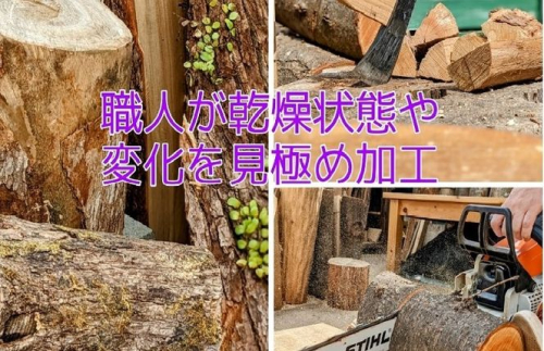国産の様々な品種の丸太や木材などを、工房で木の変化を見極め職人が木の活用法を検討の上、薪に適した木の品質に応じて加工しています。また、使い難い大きな薪と異なり、初心者や現地で火の調節を求められる方向けに大小様々なサイズに加工、燃え易い針葉樹と、火持ちの良い広葉樹の使用割合、サイズや乾燥状態も考慮しています。細かくカットした燃えやすい木屑も用意しているので、保存や廃棄に不便な着火材も不要です。また、木の種類もわかる様に記載しています。尚、箱の底は、現地屋外で直置きしても湿らない様にしていますので、横や逆向きにしない様にお願いします。