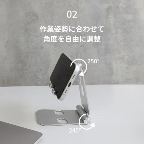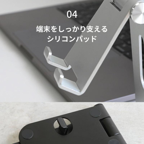 シンプルなアルミスタンドは自宅はもちろん職場など、どんな場所に設置しても違和感なく溶け込むデザインです。