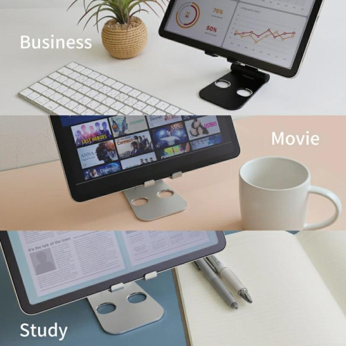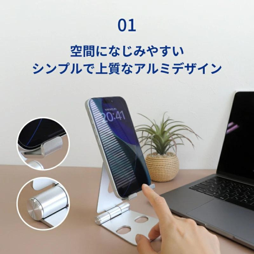 シンプルなアルミスタンドは自宅はもちろん職場など、どんな場所に設置しても違和感なく溶け込むデザインです。
