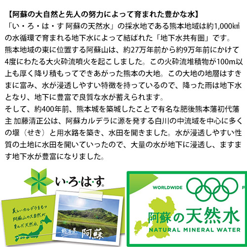 ※「い・ろ・は・す阿蘇の天然水」は、阿蘇・熊本地域の共有の財産である豊富で良質な地下水を使用した製品であり、阿蘇・熊本地域の14市町村が連携し、共通の返礼品として採用しています。