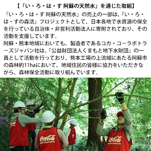 商品説明:2019年5月、「い・ろ・は・す 天然水」の採水地として新たに加わった、阿蘇・熊本の自然が育んだ「阿蘇の天然水」をお届けします。 阿蘇外輪から熊本地域まで約20年の歳月をかけて磨かれ、ミネラル分や炭酸分がバランスよく溶け込んだ、おいしくて体にやさしい天然のミネラルウォーターをご賞味ください。