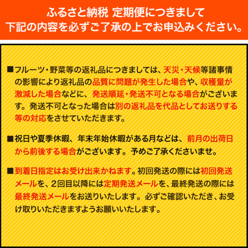 定期便につきまして 右の内容を必ずご了承の上でお申込みください。:■当定期便は、定期的にお届けをさせていただく返礼品でございます。回数/頻度については掲載しております返礼品名をご確認いただきますようお願い申し上げます。また、指定のお届け回数の途中で定期便を終了することは出来かねますので、ご注意くださいませ。