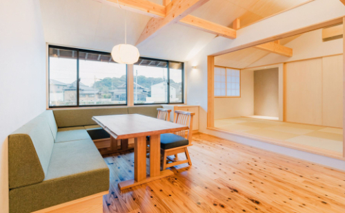 国生みを果たされた神様をお祀りしている、伊弉諾神宮。そのすぐ横の宿泊施設です。(1階はカフェ、2階が貸別荘になっております。)お部屋の特徴としては、ゆっくりと寛いで頂ける和モダンのお部屋になっております貸別荘です。木の香りと、畳のあるお部屋で、ゆっくりと旅の疲れを癒して下さいませ。