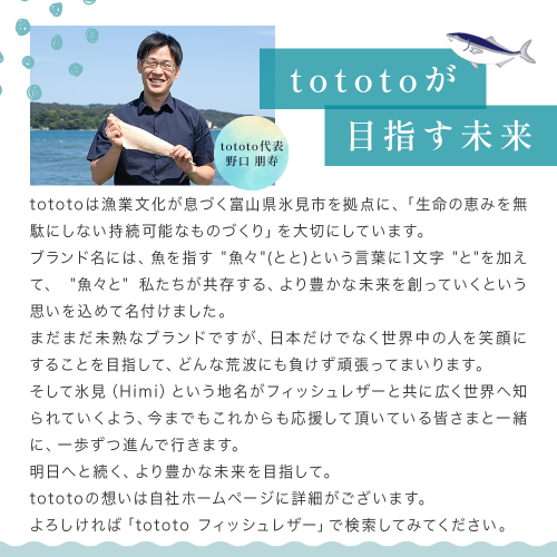 そんなオンリーワンのフィッシュレザーは、他の誰でもない「自分らしさ」を演出します。もともと廃棄されるはずだった魚の皮。私達の身近にある魚をフィッシュレザーとして使う、“心弾む日常”をお届けします。