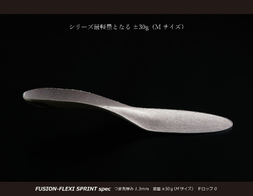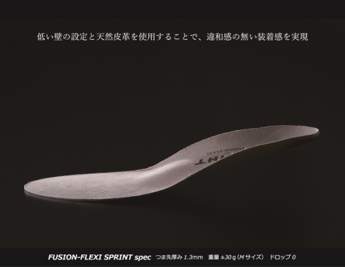 さらに、シリーズ最軽量(Mサイズ片足約30g)に仕上げた点もポイントです。「FUSION FLEXI SPRINT」は、究極の競技向けインソールとして、ダイレクトなパワー伝達、繊細な接地感覚を求める競技者に使用を推奨、特に自転車トラック競技、ロードバイク、短距離走トラック競技に支持されています。