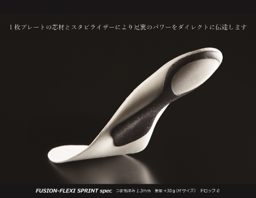 「FUSION FLEXI SPRINT」は、クッション材を持たない全面芯材の1枚プレート構造で、厚みはわずか1.3mm。インソールとしてはかなりの薄さですが、様々な競技にも対応できるしなやかさと適度な足部の安定性は、1枚プレート構造とスタビライザーの装着によって実現されています。