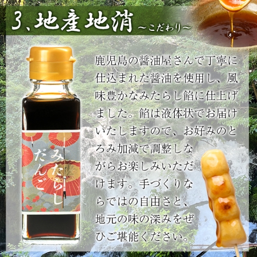水源地からの湧水で、美味しいみたらし餡を作りました。 《原材料》 うるち米(国産)(鹿児島製造)、キビ糖、しょうゆ(大豆・小麦含む)、澱粉 《アレルギー表示》 大豆・小麦 《保存方法》 -15℃以下で冷凍保管して下さい。 解凍後は、10℃以下で冷蔵保管して下さい。 《地産理由》 商品化するまでの全ての工程を市内で行っているため 株式会社はやと離宮 0995-73-8196