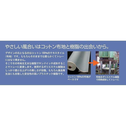 デザインの元となるのはコットン100%のテキスタイル(布地)です。その布地を丈夫な樹脂でサンドイッチ成形することでトレーに変身します。使用するポリエステル樹脂はしっかり感と仕上がりの美しさが自慢。もちろん食品衛生法にも合致した安全性の高いプラスチック樹脂です。
