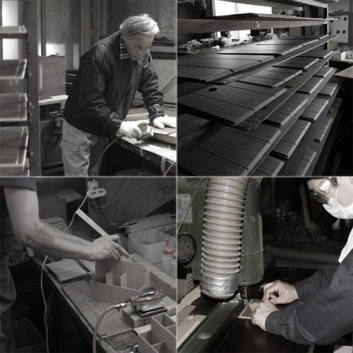 バスクシリーズの生産は、日本三大漆器産地のひとつ、紀州漆器の里、和歌山の工場で作られます。木製漆器に携わってきた橋本達之助工芸の職人達がひとつひとつ作り上げています。5.5mmの合板を2mm削って接着する、といった繊細な加工は漆器職人ならではの技法です。使用する合板は低ホルムアルデヒドのF★★★★認定品です。