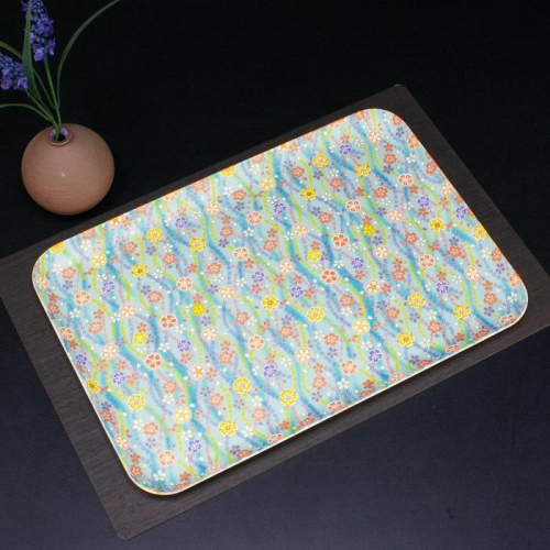 伝統のある京友禅和紙の繊細さと鮮やかさをそのままに、紀州漆器の技術で作られた、ランチョンマット型のトレイ。使用している和紙は、京都の老舗メーカー「寿工芸」様が製造している和紙。着物の友禅染めなどに代表される伝統的な文様や色をあしらった純和風柄から、どこか懐かしい日本人に馴染みのある模様と、現代風のモダンなデザインを融合させた和モダンまで、様々な和紙の中から、おしゃれな柄をチョイスしました。