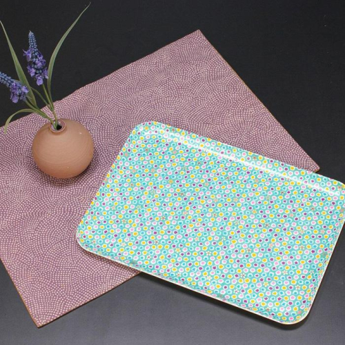 伝統のある京友禅和紙の繊細さと鮮やかさをそのままに、紀州漆器の技術で作られた、ランチョンマット型のトレイ。使用している和紙は、京都の老舗メーカー「寿工芸」様が製造している和紙。着物の友禅染めなどに代表される伝統的な文様や色をあしらった純和風柄から、どこか懐かしい日本人に馴染みのある模様と、現代風のモダンなデザインを融合させた和モダンまで、様々な和紙の中から、おしゃれな柄をチョイスしました。