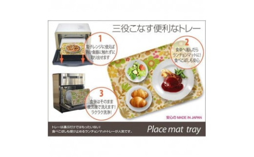 ヨーロッパの洋食器をイメージしたエレガントなテキスタイル(布地)の風合いをそのままに、お盆の産地で知られる、紀州漆器の技術で作られた三役こなす便利なトレーです。エレガントなフラワーデザインのトレーは、毎日の食卓を華やかに彩ってくれます。持ち手部分を小さくして隅々まで使えるようにデザインされたスクエアフォルム。こちらのトレーは電子レンジ対応なので、トレーに食器をのせたままレンジに入れて「チン!」することができます。3分以内の加熱ならトレーは手で持てる範囲の温度です。加熱後は、熱い食器に触れることなくトレーごと取り出せます。お料理をのせてテーブルへ運んだ後は、そのままランチョンマットにもなってくれる優れもの。お子様の食べこぼしも受け止め、テーブルを汚れから防いでくれます。食品衛生法にも合致した樹脂を使用していますので、お子様にも安心してご利用頂けます。布製のランチョンマットとは違い、食べこぼしは食後にさっと水洗いができるのはもちろん事、家庭用食洗機でも洗浄頂けるので便利です。