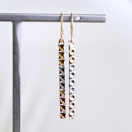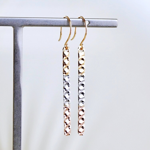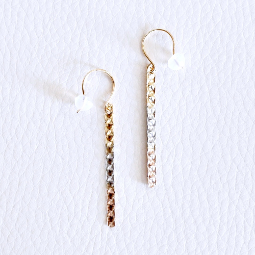 【商品詳細】 3カラーのピアスです。 上からイエローゴールド、プラチナ、ピンクゴールドのカラーになっております。 3カラーなので他のジュエリーアイテムとコーディネートもしやすく、シンプルなフォルムもスタイリッシュです。 プレートにテクスチャーを加え様々な角度から煌めきを放つようになっております。 ケースに入れ、リボンをかけてお届けいたします。 【原材料】 素材:Pt900(プラチナ),K18YG(イエローゴールド),K18PG(ピンクゴールド)