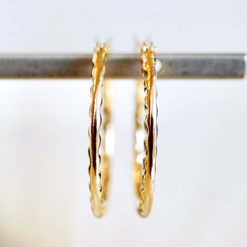 【商品詳細】 K18のフープピアスです。 シンプルで着けやすくデイリーに活躍してくれるアイテムです。 フープの地金側面にテクスチャーを加え、技ありのデザインがポイントです。 人気のフープタイプで、ひとつは持っていたい定番アイテムでありながら直径20mmの存在感。 お気に入りの一つになるのではないでしょうか。 ケースに入れ、リボンをかけてお届けいたします。 【原材料】 素材:K18(18金) イエローゴールド