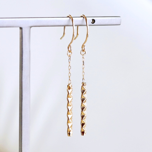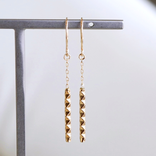 【商品詳細】 K18のピアスです。 テクスチャーの入っている地金チャームは18mmでチェーンで繋ぎ全長40mmの長さになっております。 地金面には様々な角度から煌めきを放つように角度のついたテクスチャーが入っております。 軽やかにゆれて耳元をスタイリッシュに演出してくれます。 ケースに入れ、リボンをかけてお届けいたします。 【原材料】 素材:K18(18金) イエローゴールド