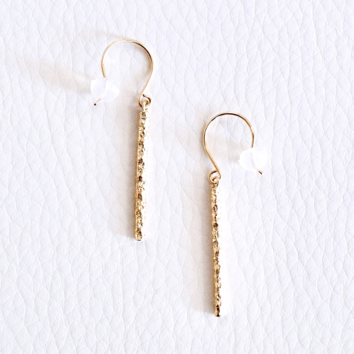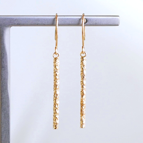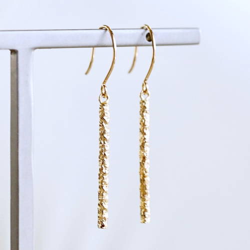 【商品詳細】 K18のシンプルピアスです。 スタイリッシュなストレートラインにはテクスチャーを施し、上品な煌めきを放ちます。 耳元で軽やかに揺れます。 シンプルなデザインなので着けやすく、デイリーに活躍してくれるアイテムです。 ケースに入れ、リボンをかけてお届けいたします。 【原材料】 素材:K18(18金) イエローゴールド