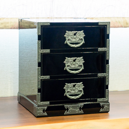 ずっしりとした高級感があり、息をのむほど美しい鏡面仕上げの黒呂漆塗り。仙台箪笥の上質感をそのままに小さく、使いやすくしました。