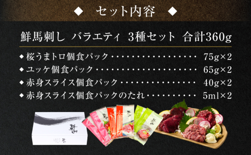 ★旅サラダで紹介されました★ 鮮馬刺しバラエティ3種セット(桜うまトロ・ユッケ・赤身スライス)馬刺し専用タレ付き 馬肉 冷凍 個装 パック 詰め合わせ