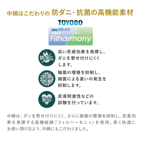 中綿に、抗菌防臭・防ダニ効果のある高機能性綿の東洋紡フィルハーモニィを使用しているので清潔で快適にお使いいただけます。