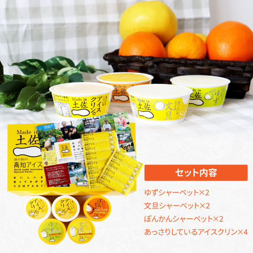 - TKA014 Made in 土佐のアイスクリンと柑橘シャーベットセット/高知を代表する素朴で懐かしい味のアイス「アイスクリン。」と土佐文旦・ゆずなどの柑橘類のジューシーな味わいの3種を組み合わせたギフトセット。2022 食べ物 詰め合わせ プレゼント 人気