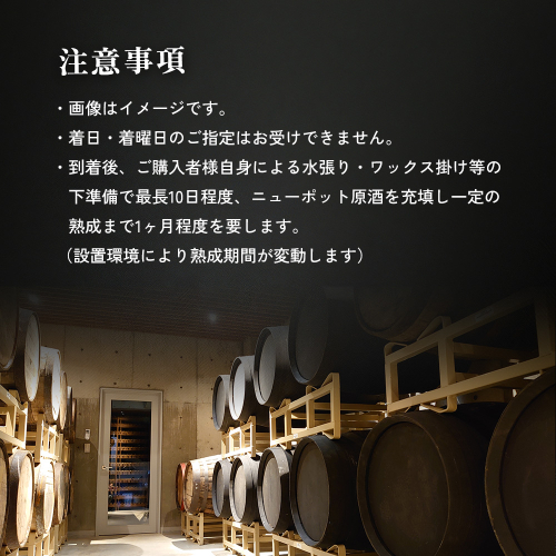 ※到着後、ご購入者様自身による水張り・ワックス掛け等の下準備で最長10日程度、ニューポット原酒を充填し一定の熟成まで1ヶ月程度を要します。(設置環境により熟成期間が変動します)