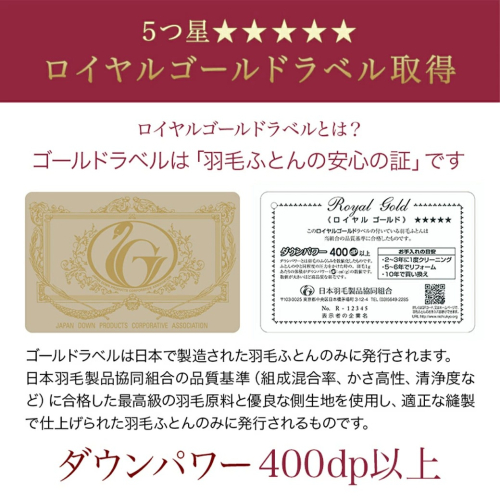 羽毛のふくらみを示すダウンパワーは400dp以上、「ロイヤルゴールドラベル」の認定を得た安心・安全な羽毛ふとんです。