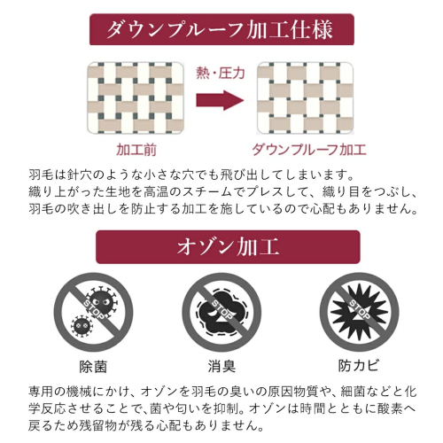 羽毛は、国内の自社工場にて入念な洗浄と蒸気式のパワーアップマシーン(高温のスチーム)加工を行い、ゴミを徹底的に除去する特別な工程を採用しています。