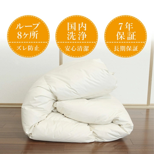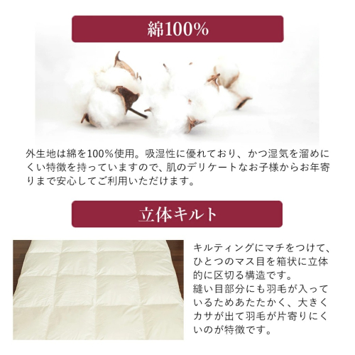 さらに、羽毛は吸放湿性に優れた素材で、お布団内の湿度を調節する機能もあるため快適な睡眠環境を作ります。