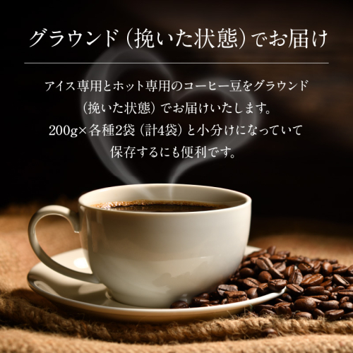 【極深煎り】【グラウンド(挽いた状態)でお届け】アイス専用&ホット専用 コーヒー豆800g(200g×各種2袋) ~お家で楽しむ自家焙煎の香り高いコーヒー~ H163-028