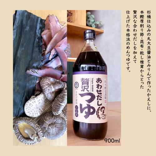 杉桶仕込みの丸大豆醤油とみりんで作ったかえしに、本鰹厚削り節・昆布・乾し椎茸からとった贅沢な合わせだしを加えて仕上げた本格派のめんつゆです。