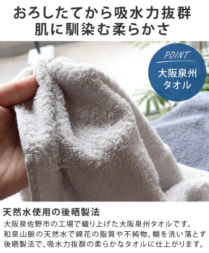 大人気!大阪泉州タオル10枚セット。泉州で作られるタオルは和泉山脈の天然水を使った後晒により、肌になじむ柔らかさと吸水性に優れたタオルに仕上がります。薄手だから早く乾き、気軽に使えるデイリー仕様のシンプルタオル。頭にも巻きやすいロング丈タイプです。