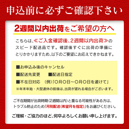 2週間以内出荷をお選びの方は、申込み後のキャンセル・不在日対応・配送日指定・配送先変更はお受けできかねます。