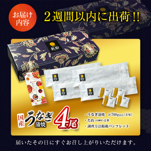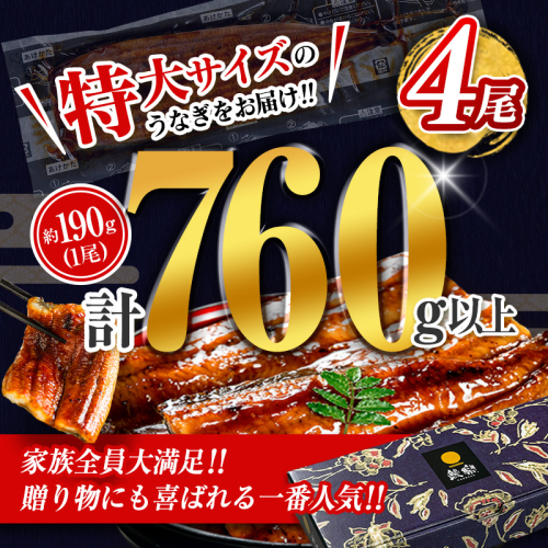 <2週間以内に出荷>最短 最速 特大 うなぎ 鰻楽 国産 蒲焼 4尾 人気 無頭 計760g以上 高評価 おすすめ 冷凍 簡単調理 個包装 鰻 魚介 贈答品 ギフト 贈り物【C388-760-2W】