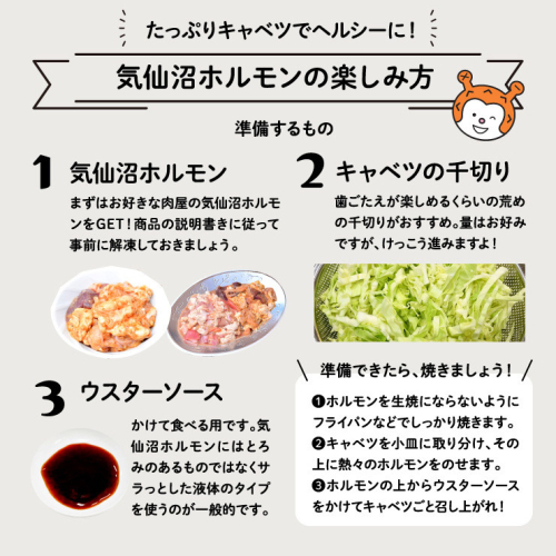 千切キャベツにウスターソースをかけ、その上に焼いたホルモンをのせて一緒にお召し上がりください。