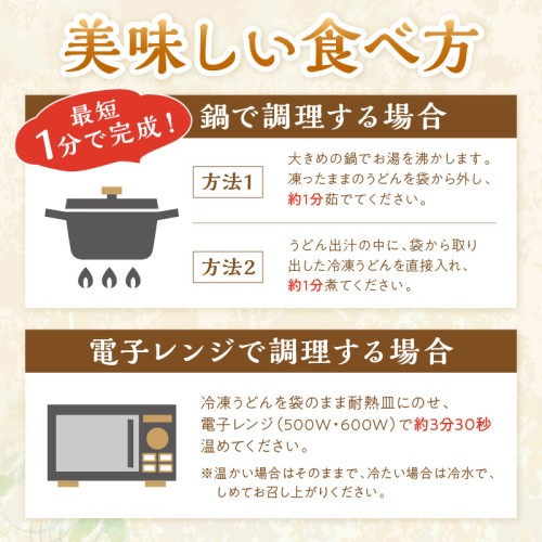 凍ったままのうどんをラップのまま皿にのせ、電子レンジ(500W・600W)で約3分30秒加熱してください。