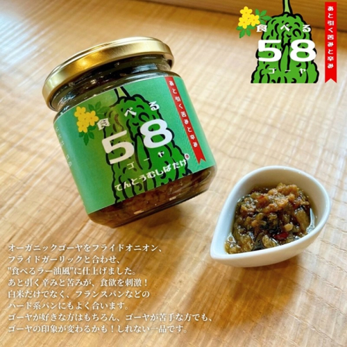 【食べる58(ゴーヤ)】は、オーガニックゴーヤをフライドオニオン、フライドガーリックと合わせ、"食べるラー油風"に仕上げました。あと引く辛みと苦みが、食欲を刺激!白米だけでなく、フランスパンなどのハード系パンにもよく合います。ゴーヤが好きな方はもちろん、ゴーヤが苦手な方でも、ゴーヤの印象が変わるかもしれない一品です。(商品名の58は、沖縄のメインストリート国道58号線(通称ごっぱち)からきています)