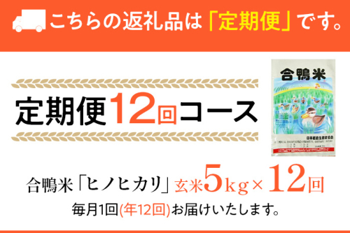 令和7年産 合鴨米「ヒノヒカリ」(玄米・5kg)定期便12回コース BI06 ※2025年10月より順次出荷予定