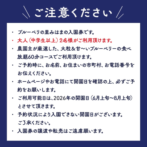 ブルーベリーの里みはまの入園券です。 大人(中学生以上)2名様がご利用頂けます。 農園主が厳選した、大粒&甘~いブルーベリーの食べ放題60分コースでご利用頂けます。 ご予約は「ブルーベリーの里みはま」のホームページまたはお電話(070-9039-8981)からお願いします。 ご予約時に、お名前、お住まいの市町村、お電話番号をお伝えください。 ホームページやお電話にて開園日を確認の上、必ずご予約をお願いします。 ご利用可能日は、2026年の開園日(6月上旬~8月上旬)とさせて頂きます。 予約状況により入園できない開園日がございます。ご了承ください。 入園券の譲渡や転売はご遠慮願います。 ※本返礼品は入園券の発送は行いません。 ※寄附完了時に送付されるメールが、入園券の代わりとなります。寄附完了メールはご来園時に確認させていただきますので、ご来園いただくまで必ず保存しておいていただくようお願いします。 ※また、ご予約時には必ずお名前、お住まいの市町村、お電話番号お知らせください。