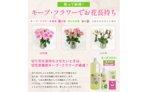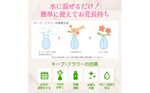 キープ・フラワーは1972年静岡市清水区で製造発売され、全国の生花店やお花好きな消費者の皆様に50年以上ご愛用頂いている商品です。 切花の活け水に混ぜることで、大地に咲くお花のように大きく、キレイにそして長持ちします。 500mlのお水にキープ・フラワーを10mlを薄めてご使用下さい。 花びんの水が減ってきたら同じ割合で薄めた液を補充してください。 新しく活ける時は、花びんをよく洗って50倍に薄めてご使用下さい。 事業者:フジ日本株式会社 キープ事業部