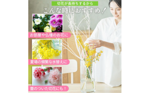 切花の活け水に混ぜることで、大地に咲くお花のように大きく、キレイにそして長持ちします。