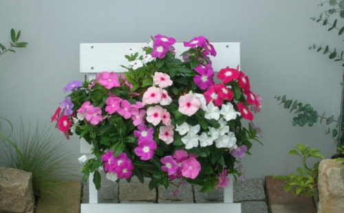 綺麗に寄せ植えされており、花ばかりでなく綺麗です。形も一般の鉢でなく壁面に置くのに良い形でレンガを一つ有るのも気が利いているなと感じました。