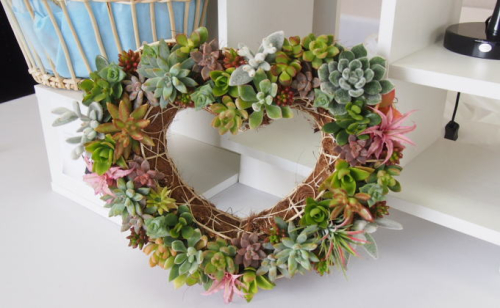 可愛い多肉植物たちの寄せ植えアレンジ!ハートのサークルでオシャレ度と可愛さをさらにアップ!!ハート型リースに詰め込んだ多肉植物たちの多彩な色合い、質感を楽しめます。