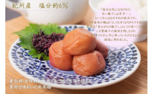 しそ漬梅干の風味を残しながらも、食品添加物は使用せず塩分を約6%におさえた素朴な味わいの梅干です。