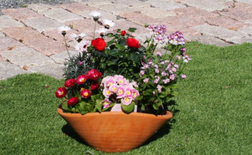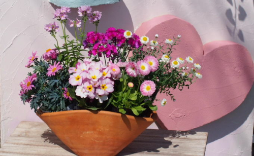 鉢の形がおしゃれでユニークなテラコッタ鉢。色の濃淡や大小の花を バランス良く配置することで、一つの鉢の中で変化が生まれます。玄関ポーチやお庭に飾って置いて季節のうつろいを感じてください。