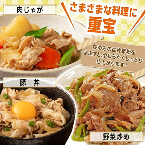 炒めものに使う場合は片栗粉をまぶすことで加熱時に水分が失われるのを防ぎ、やわらかくしっとり仕上がります。料理前にちょっとひと手間加えてみるのもおススメです♪炒め物を中心に、さまざまな料理に重宝します。