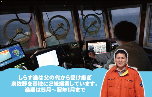 泉佐野でしらす漁を操業して35年以上を誇るベテランしらす漁師が、自分で獲ったしらすの中から上質なものを目利きの上、迅速に加工し、急速冷凍の上、お送りいたします。こだわりは、水揚げした直後の沖合の漁船内でできうる丁寧な洗浄と迅速な氷締めを徹底していることで、鮮度抜群のしらすの風味や食感を味わっていただけること。