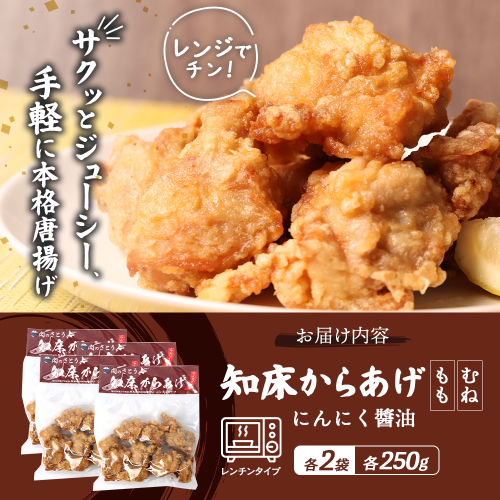 レンジで簡単 知床からあげ にんにく 醤油 もも肉 むね肉 1kgセット | オンライン申請 ふるさと納税 北海道 中標津 唐揚げ 全2種 250g×各2パック にんにく 醤油 レンチン 揚げたて 冷凍食品 時短 調理 鶏 ザンギ おかず 惣菜 弁当 専門店 店の味 お取り寄せ ワンストップ マイページ 肉のさとう 中標津町