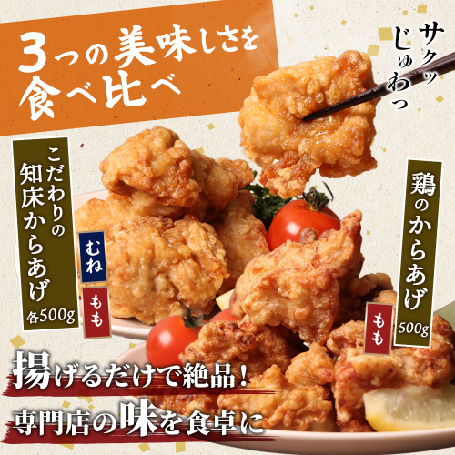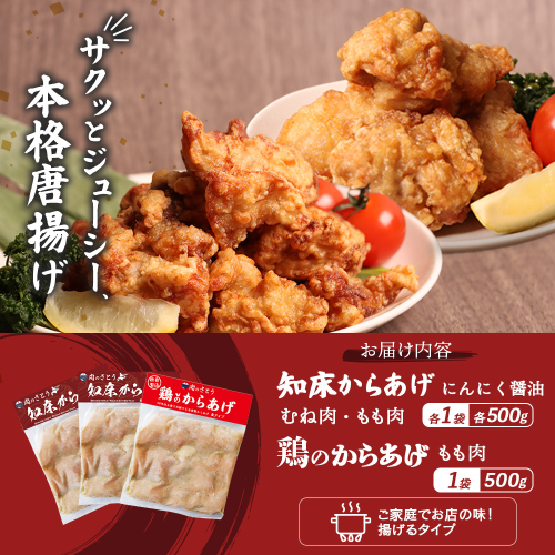 揚げるタイプ 知床からあげ にんにく 醤油 もも肉 むね肉 鶏のからあげ 1.5kgセット | オンライン申請 ふるさと納税 北海道 中標津 唐揚げ 全3種 500g×各1パック にんにく 醤油 鶏 時短 調理 ザンギ おかず 惣菜 弁当 専門店 店の味 お取り寄せ ワンストップ マイページ 肉のさとう 中標津町