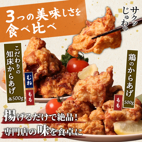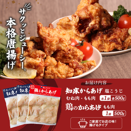 揚げるタイプ 知床からあげ 塩こうじ もも肉 むね肉 鶏のからあげ 1.5kgセット | オンライン申請 ふるさと納税 北海道 中標津 唐揚げ 全3種 500g×各1パック 塩 麹 鶏 時短 調理 ザンギ おかず 惣菜 弁当 専門店 店の味 お取り寄せ ワンストップ マイページ 肉のさとう 中標津町